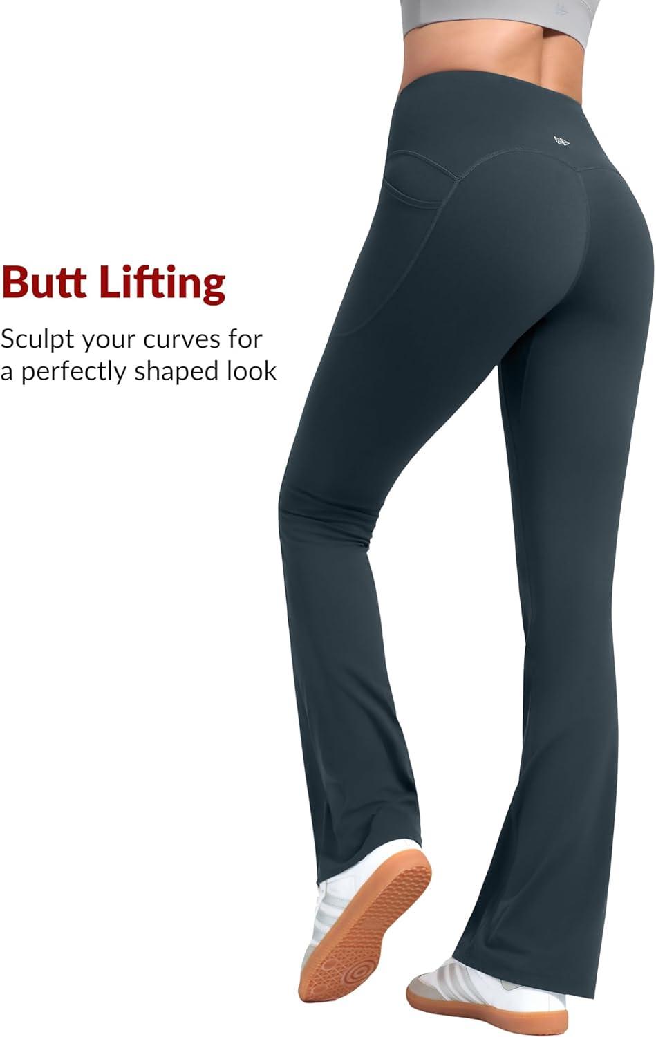 Yvette Flare Yoga Leggings for Women with Pockets High Waisted Tummy Control Non See Through Gym Workout Bootcut Pants(Haze Blue)