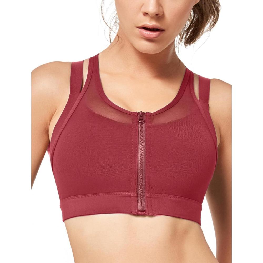 Yvette High Impact Women Sports Bra Front Closure Double Deck Mesh Running Bra for Plus Size(Coral Red)