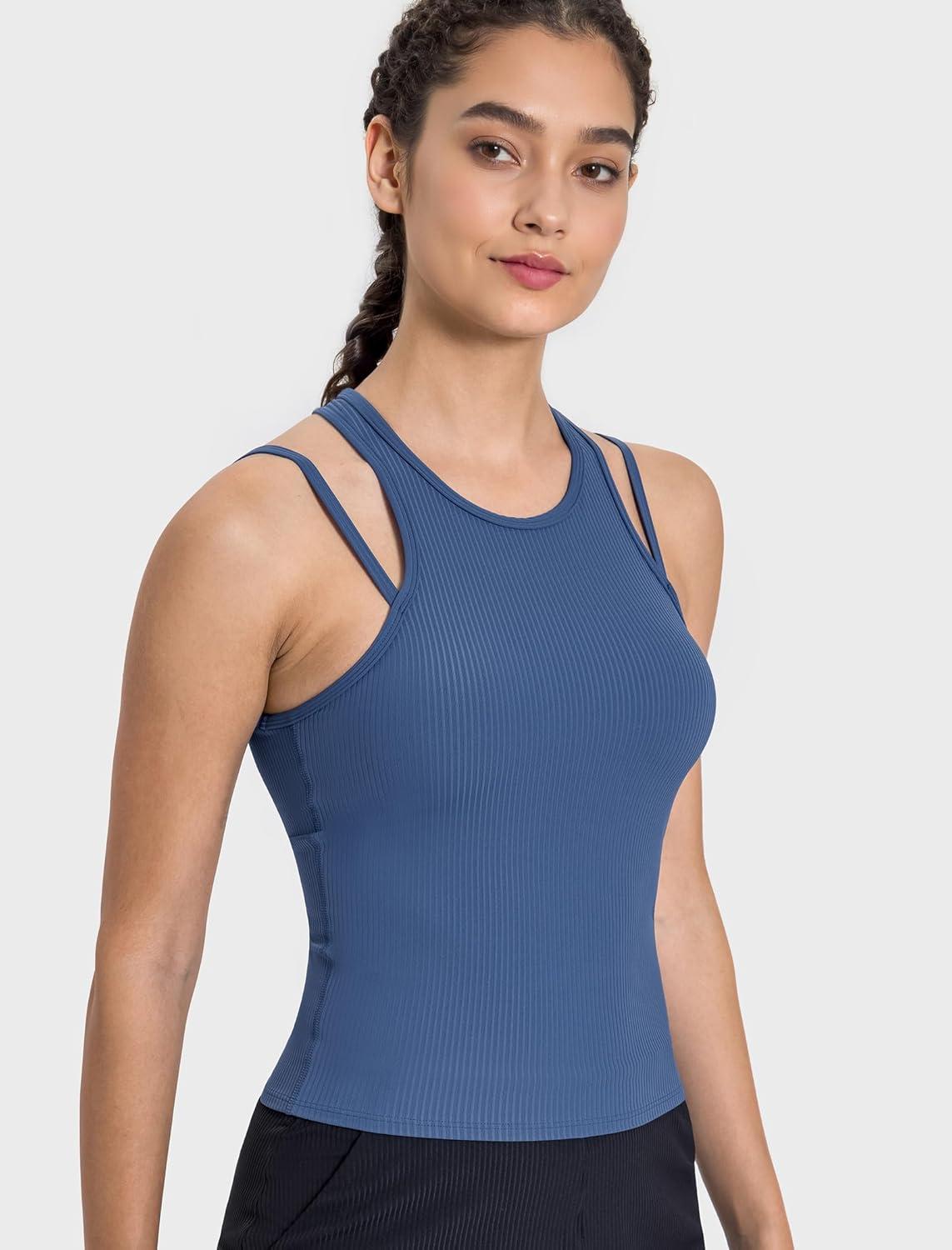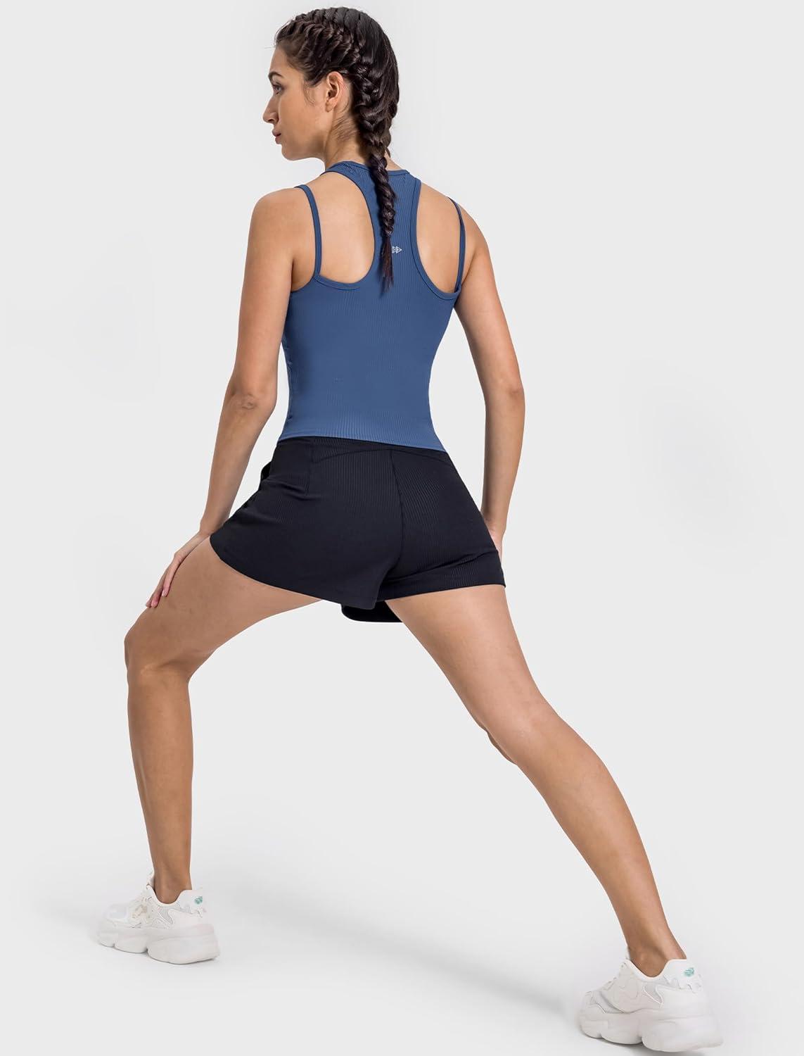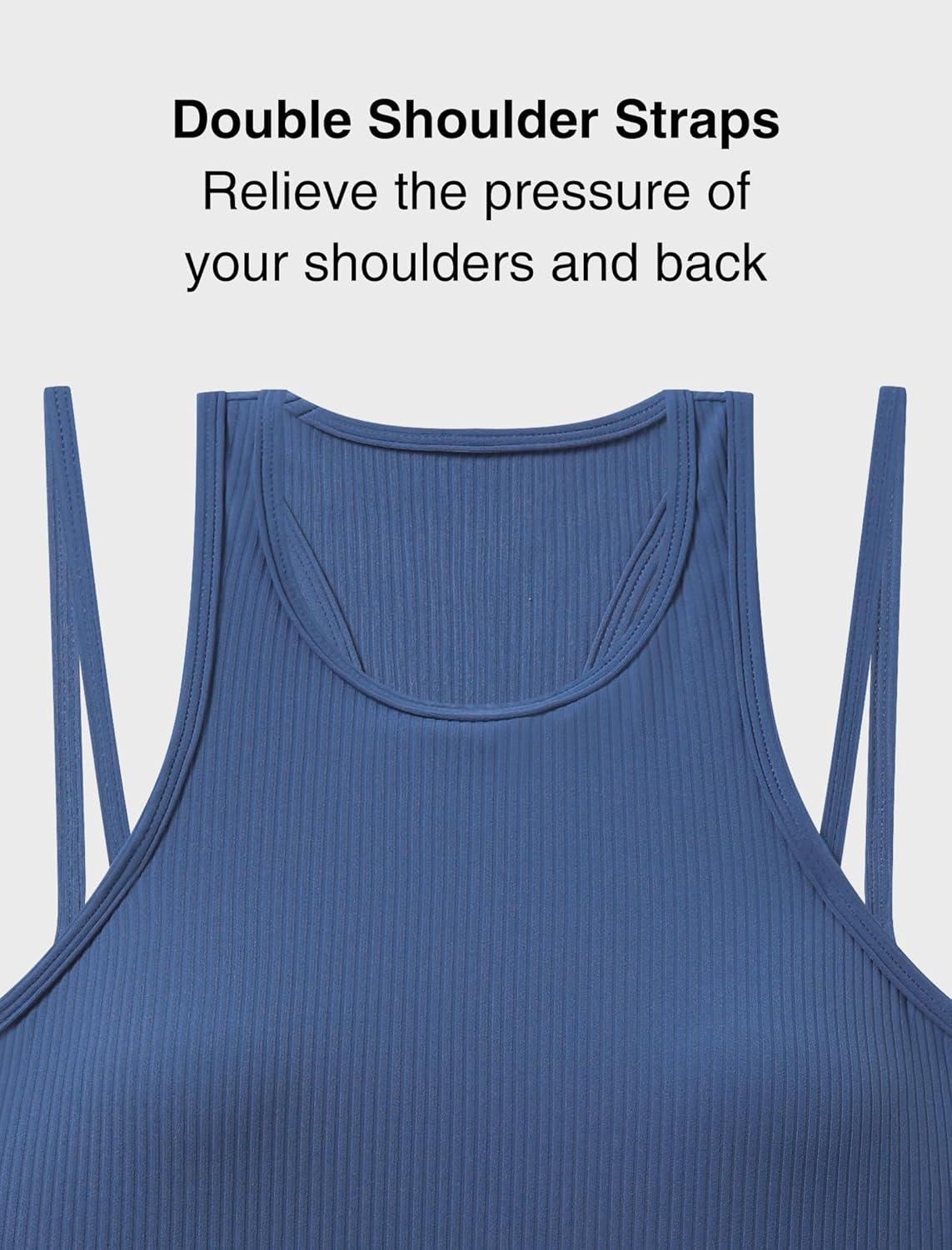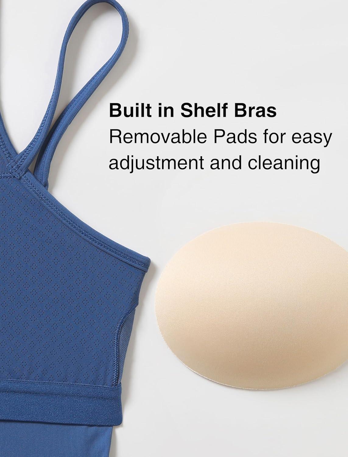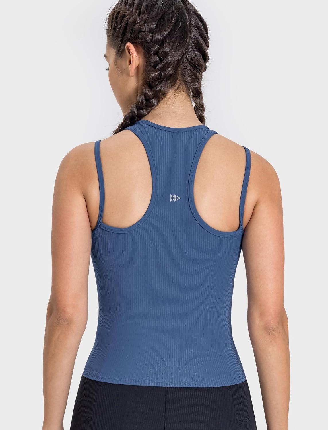 imageYvette Racerback Crop Top with Removable Built in Bra Thin Straps Sports Bra for WomenBlue