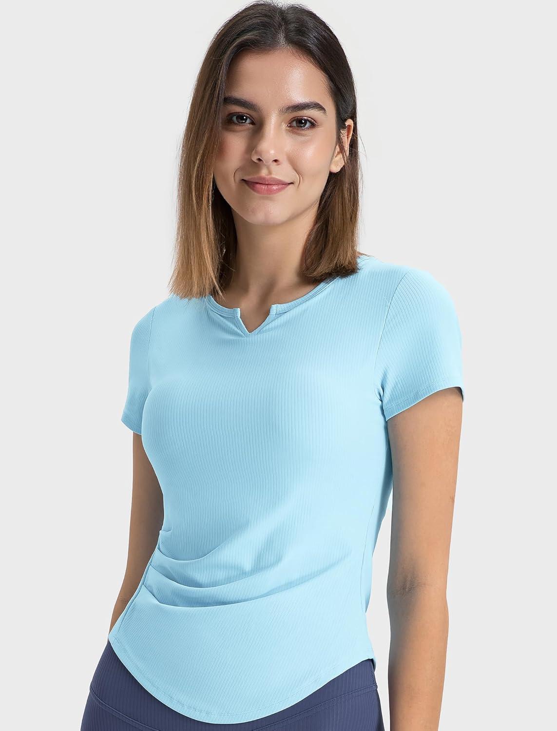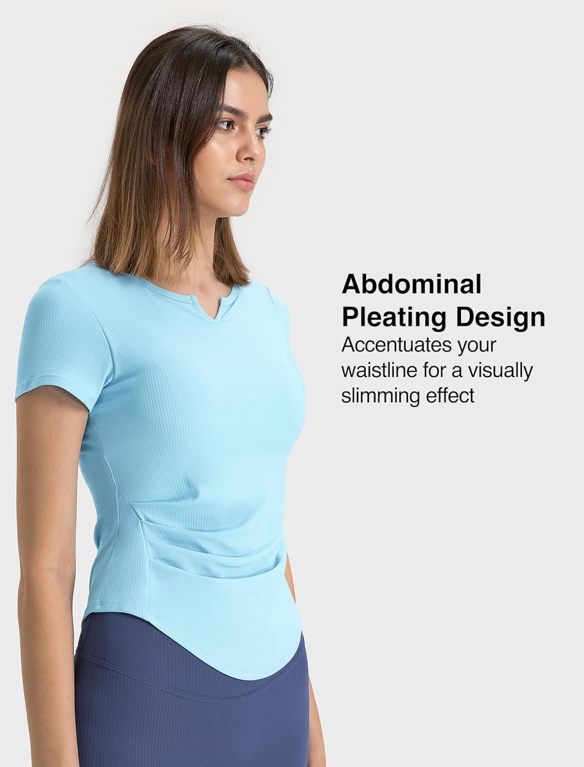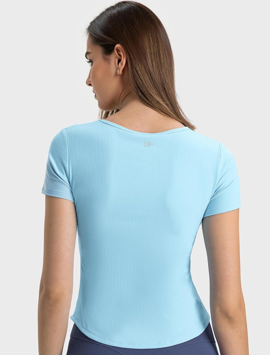 Yvette Tank Top Built in Bra for Women Slim Fitted Casual Short Sleeve Ruched Athletic Shirts for Gym Yoga Running(Blue)