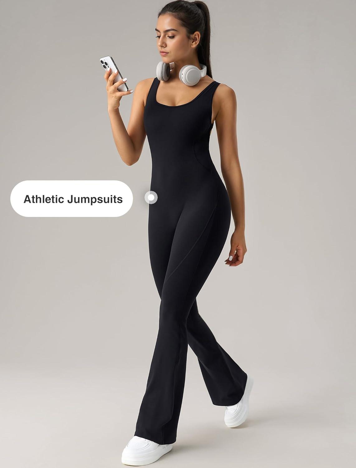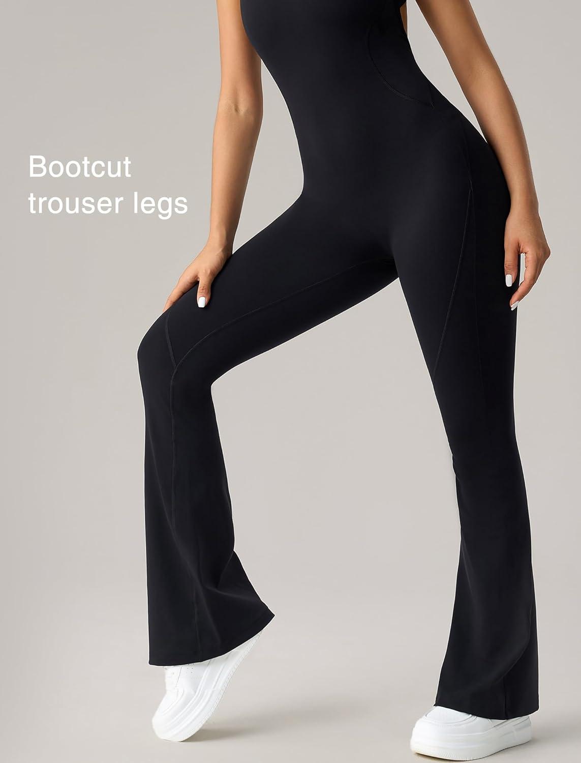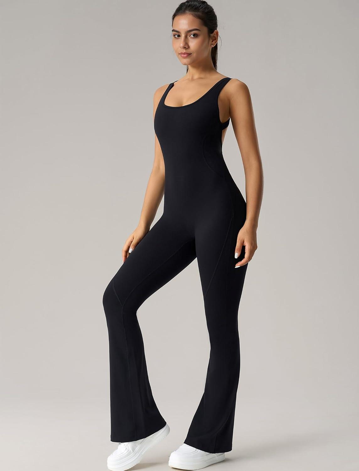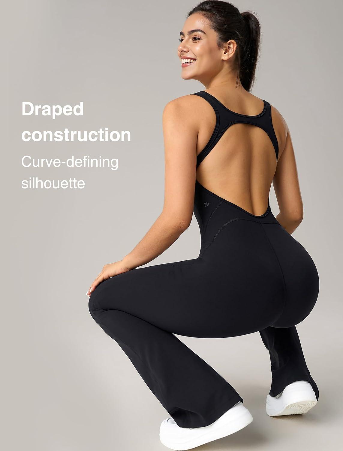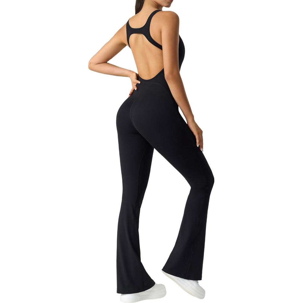 Yvette Women's Backless Jumpsuits Built in Bra Gym Workout Yoga Rompers Flare Leggings Bodycon Bodysuits(Black)